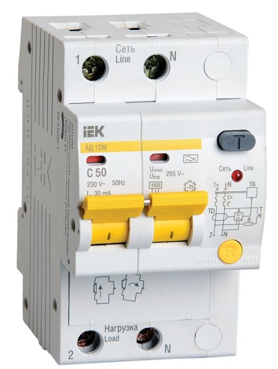 В изделиях предусмотрена индикация срабатывания от дифференциального тока, а для АД12М также светодиодная индикация включенного состояния. АД12М сохраняет работоспособность при снижении напряжения электрической сети до 110 В.