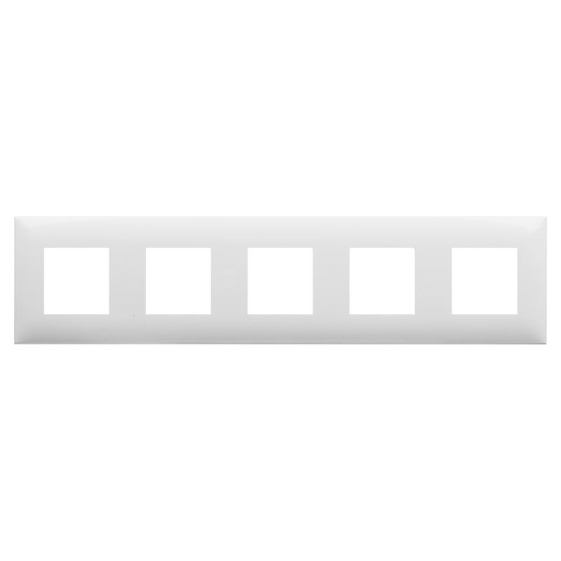 Рамка имеет 5 мест под электроустановочные изделия (максимальная вместимость – 10 модулей), может размещаться как горизонтально, так и вертикально. Габаритные размеры: 375х90 мм. Материал – термопласт.