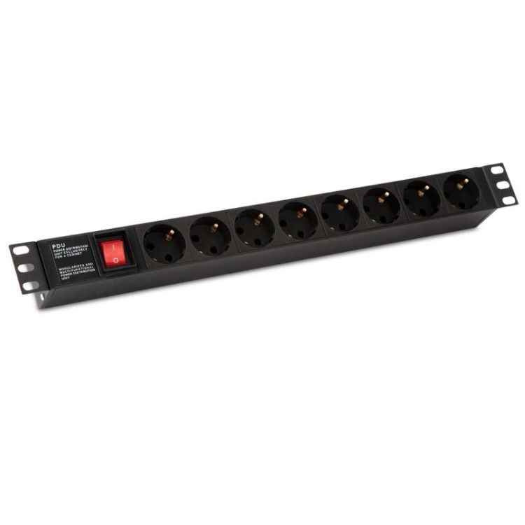 Блок розеток SHE19-8SH-S-IECд.19"шк.,горизонт.,с выкл.с подсв.,8 роз.Schuko(10А),250В,без каб.пит.,4