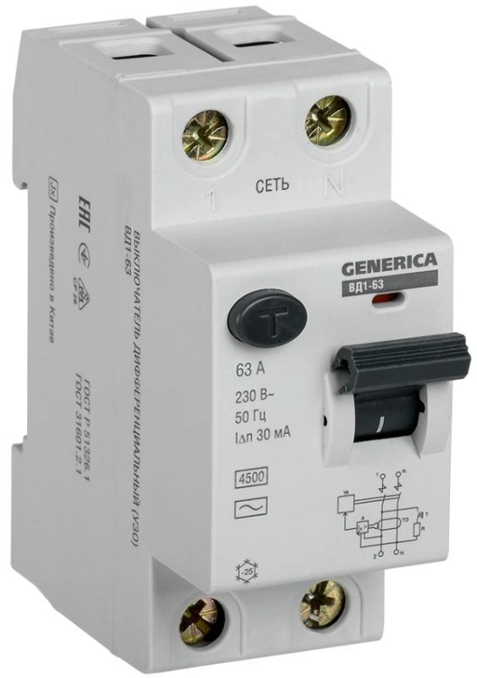 Выключатель дифференциальный (УЗО) ВД1-63 2п 63А 30мА тип AC | MDV15-2-063-030 | GENERICA