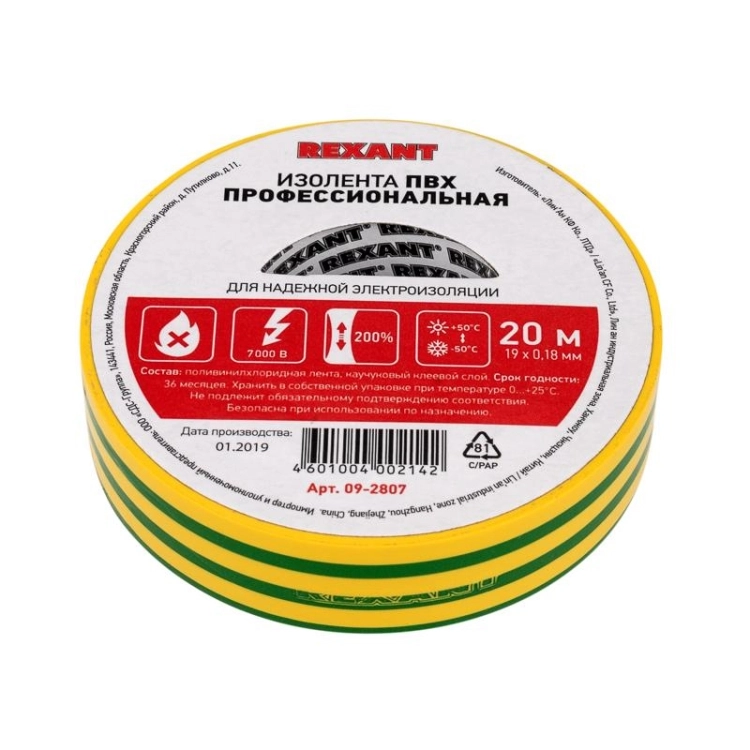 Изолента ПВХ профессиональная 0,18х19 мм х 20 м, желто-зеленая (в упак. 10 шт.) | 09-2807 | REXANT