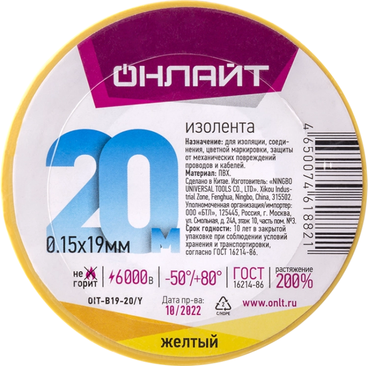 Изолента 61 882 OIT-B19-20/Y ПВХ желтая (Китай) |61882 | ОНЛАЙТ