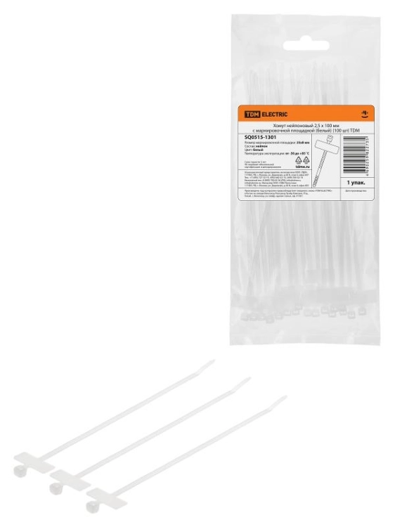 Хомут нейлоновый 2,5 х 100 мм с маркировочной площадкой (белый) (100 шт) | SQ0515-1301 | TDM