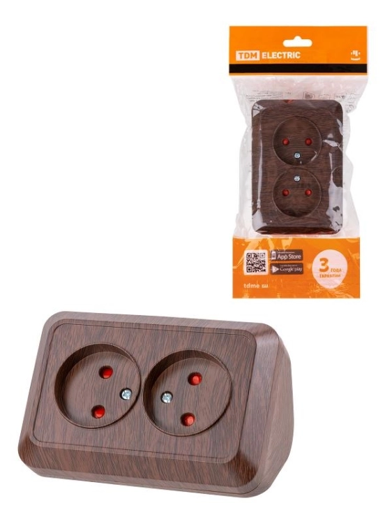 Розетка угловая двойная 2П открытой установки с з/ш IP20 250В 10А бук "Ладога" | SQ1801-0342 | TDM