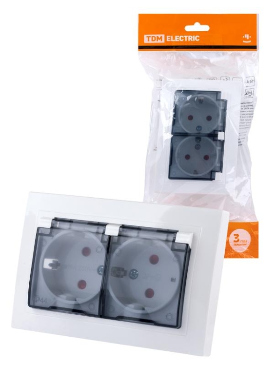 Розетка двойная 2П+З с защ. шт. и прозрачной крышкой 16А 250В IP44 белая "Таймыр" | SQ1814-0077 | TD