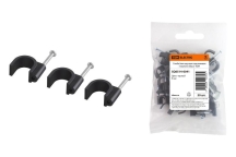 Применение:Для быстрого и надёжного крепления круглых и плоских кабелей или проводов различного назначения (силовых, телефонных, телевизионных и т. п.) в жилых и промышленных помещениях.Возможно крепление к различным поверхностям: к дереву, прессованному картону, швам кирпичной кладки, к штукатурке, бетону, кирпичу. Материалы:Скоба - гибкий негорючий ударопрочный полипропилен.Гвоздь - закаленная оцинкованная сталь.Преимущества:Широкий типоразмерный ряд: до 35 мм.Скобы выпускаются в двух исполнениях  полукруглые и плоские.Поставляются с гвоздём.Гвоздь уже вставлен в скобу, что повышает удобство и скорость монтажа. 0: Применение:Для быстрого и надёжного крепления круглых и плоских кабелей или проводов различного назначения (силовых, телефонных, телевизионных и т. п.) в жилых и промышленных помещениях.Возможно крепление к различным поверхностям: к дереву, прессованному картону, швам кирпичной кладки, к штукатурке, бетону, кирпичу.